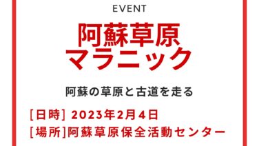 阿蘇市 第1回 阿蘇草原マラニック 開催日2023年2月4日(土曜日)開催時間8:00~15:00開催場所阿蘇草原保全活動センター(熊本県阿蘇市小里656−1)内容距離28km、累積標高1,000m(阿蘇草原保全活動センター~山田東部牧野~国造神社往復)※エイドステーション・... 2022.12.29 アクティビティ阿蘇市