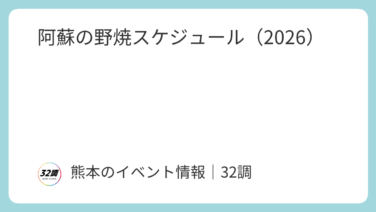 南阿蘇村 阿蘇の野焼スケジュール(2026) 2026年春阿蘇周辺で行われる野焼きの情報です。地域や場所によって開催日時が異なり、交通規制もかかります。阿蘇市の【阿蘇グリーンストック】さんでは、毎年野焼きのボランティアを募集されています。また、貴重な阿蘇の自然環境を後世に残していくため... 2026.02.03 南阿蘇村西原村阿蘇市