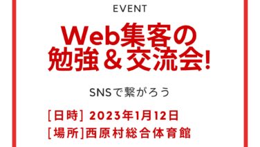 西原村 Web集客の勉強&交流会(2023年1月12日) 開催日2023年1月12日(木曜日)開催時間18:15~20:45開催場所西原村総合体育館 会議室(熊本県阿蘇郡西原村小森3161)内容Web集客やSNSを運用している方向けの勉強・交流会イベント詳細・お申込み料金無料主催者・お問合せ阿蘇マ... 2022.12.26 無料西原村