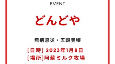 西原村 阿蘇ミルク牧場どんどや(2023) 牧場で楽しむ!小正月の伝統行事「どんどや」開催日2023年1月8日(日曜日)※天候が悪い際は、翌日以降へ延期開催時間11:00~※点火は、11:40分頃開催場所阿蘇ミルク牧場(熊本県阿蘇郡西原村河原3944−1)内容どんどや料金参加は無料※... 2023.01.01 西原村