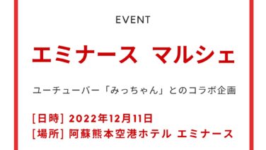 益城町 エミナースマルシェwithみっちゃんねる Vol.2 エミナースマルシェが開催されます開催日2022年12月11日(日曜日)開催時間11:00~16:00開催場所阿蘇熊本空港ホテル エミナース(熊本県上益城郡益城町田原2071−1)内容マルシェイベント・ストラックアウト・キッチンカーグルメ・ハ... 2022.11.30 無料益城町