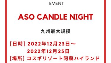 阿蘇市 阿蘇キャンドルナイト2022(12/23~25) クリスマスにも開催今回で3回目を向かえる、阿蘇キャンドルナイト今年は週末、2週にわたって開催されます。開催日2022年12月23日(金曜日)~12月25日(日曜日)開催時間各日 18:00~21:00※受付17:30〜20:30開催場所コス... 2022.11.23 ライトアップ阿蘇市