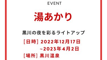 南小国町 2022年度 湯あかり 黒川温泉、冬の風物詩開催日2022年12月17日(土)〜2023年4月2日(日)開催時間日暮れ~22:00開催場所黒川温泉(熊本県阿蘇郡南小国町満願寺6594−3)内容11年目を迎えるライトアップ。球体状の「鞠灯篭」約300個と、筒状で高さ... 2022.11.30 ライトアップ南小国町無料